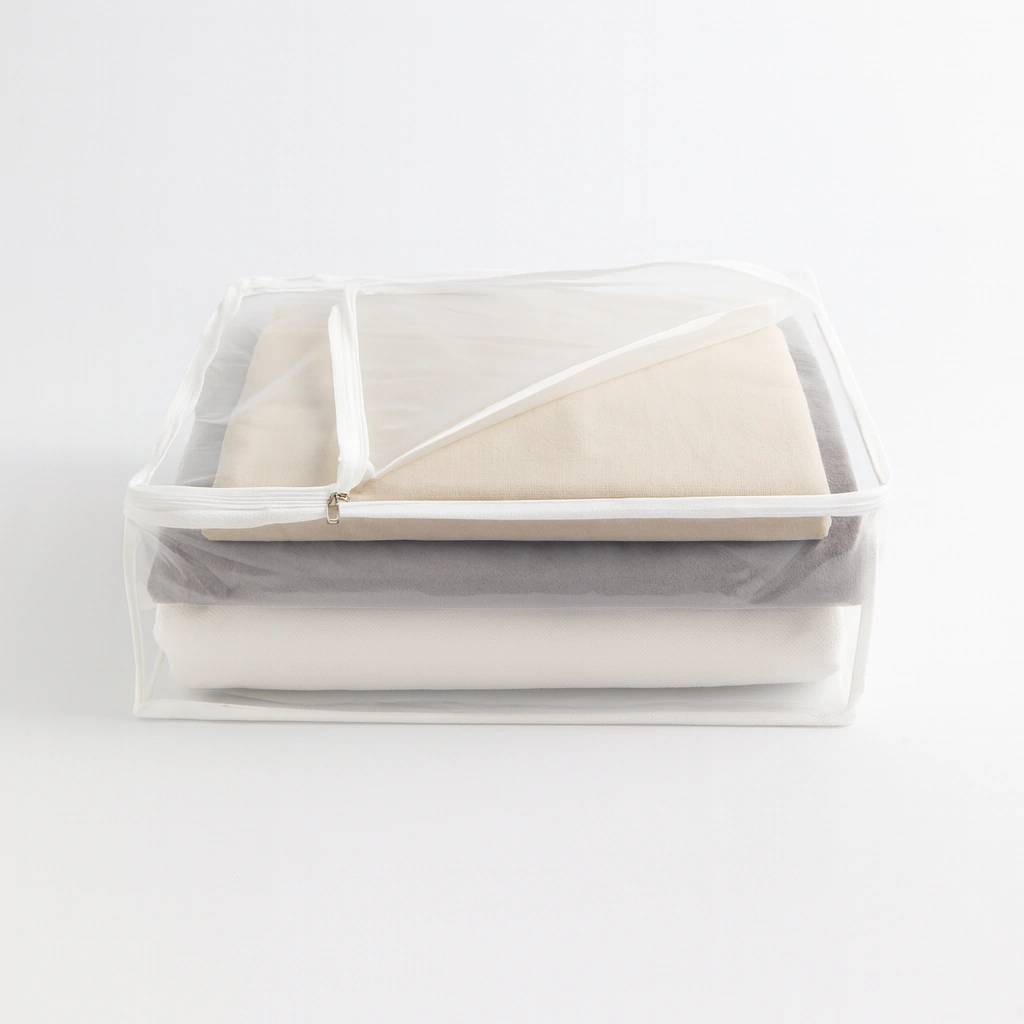 Dale orden, practicidad y protección a tu ropa con nuestra funda organizadora transparente con bordes blancos. Ideal para guardar prendas, sábanas, ropa de cama, toallas, mantas y mucho más, manteniéndolo todo limpio, visible y libre de polvo 🧺✨